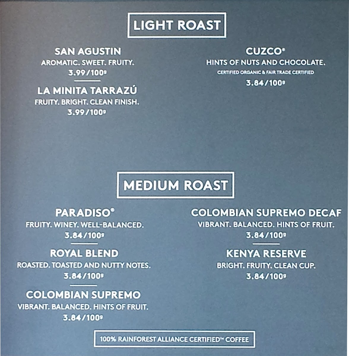 Today's feature brew of medium dark roast coffee. All Second Cup Cup Coffee Co™ beans are Fairly Traded, and 99% are Rainforest Alliance Certified™.